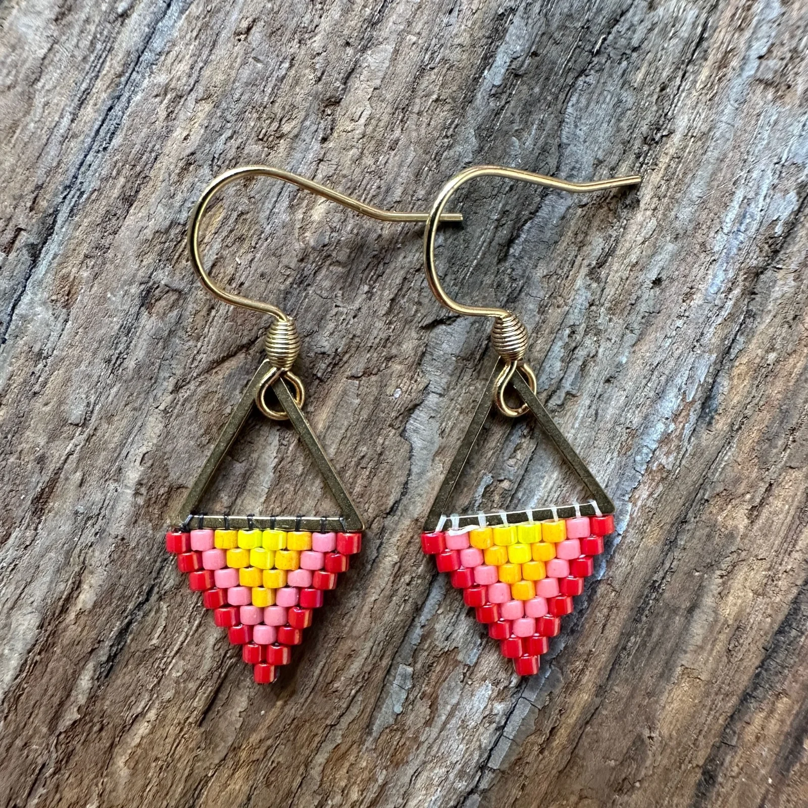 Wie ein kleiner Sonnenuntergang an deinen Ohren – diese handgewebten Dreieck-Ohrringe leuchten in einem warmen Farbverlauf aus Rot, Pink und Sonnengelb, gefasst in einem zarten goldenen Metallrahmen. Jede winzige Miyuki-Perle wurde sorgfältig in Peyote-Technik gewebt und ergibt zusammen eine präzise, lebendige Form, die an Pfeilspitzen und Sommerabende erinnert.
