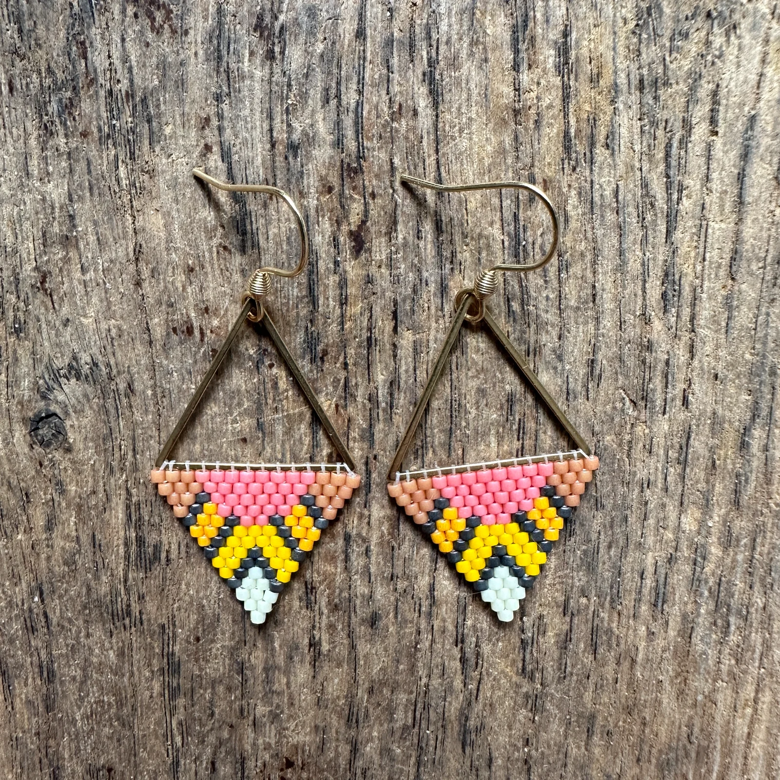 Wie der Himmel kurz bevor die Sonne versinkt – in warmen Orangetönen, strahlendem Pink und leuchtendem Gelb, durchzogen von kühlem Grau und einem Hauch Weiß an der Spitze. Diese handgewebten Dreieck-Ohrringe aus feinsten Miyuki-Glasperlen tragen das Farbenspektrum eines Sonnenuntergangs direkt ans Ohr. Der geometrische Rahmen aus goldfarbenem Edelstahl gibt dem lebhaften Muster einen edlen, strukturierten Halt.