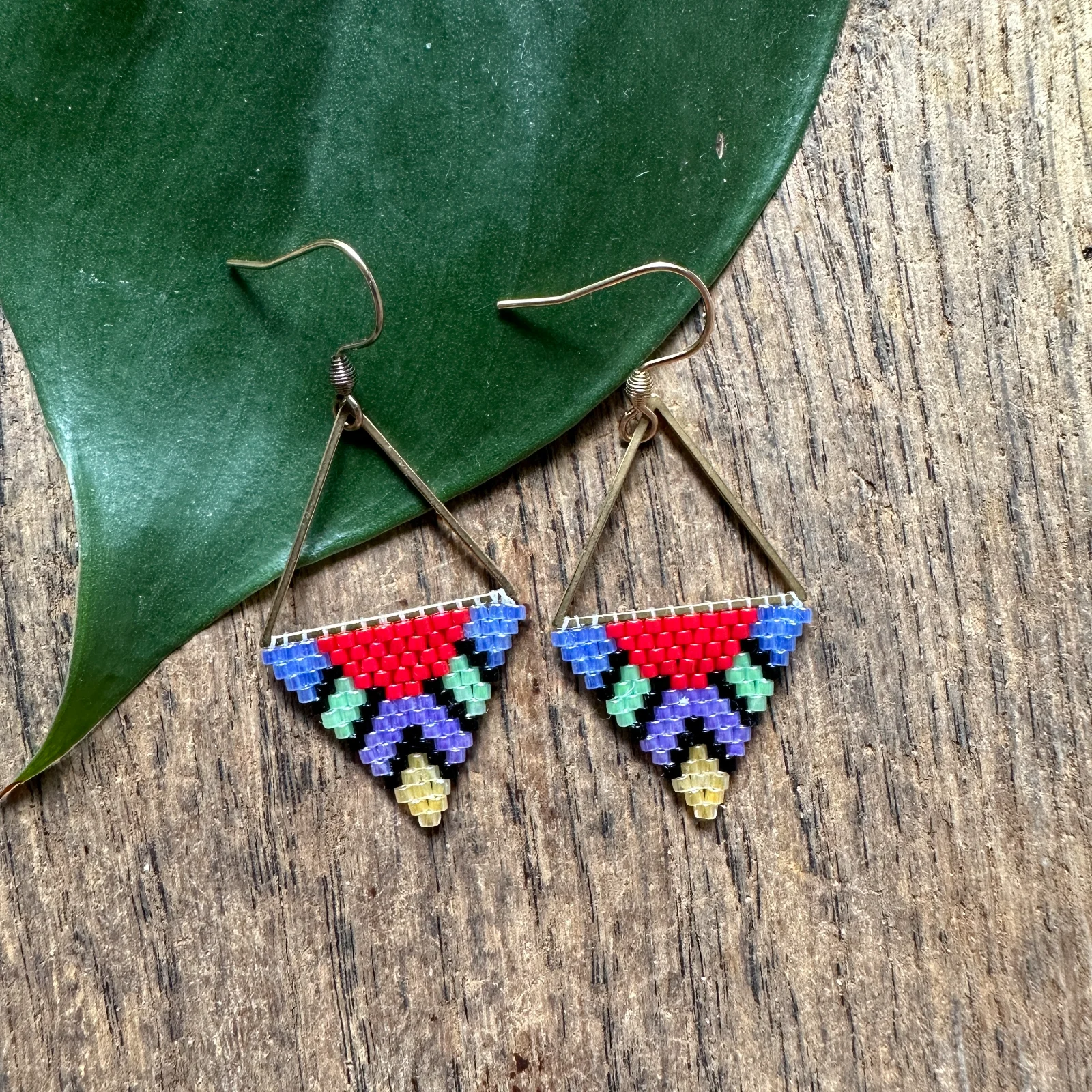 Wie ein Regenbogen, das sich in geometrische Form gefügt hat – diese handgewebten Dreieck-Ohrringe leuchten in einem kühnen Farbenspiel aus Rot, Blau, Lila, Mint und zartem Gelbgrün, eingebettet in tiefes Schwarz. Jede einzelne Miyuki-Perle sitzt präzise gesetzt im klassischen Brick-Stitch-Muster, das auf einem elegant geschwungenen Dreieck-Rahmen aus goldfarbenen Edelstahl thront und das Licht von jeder Seite einfängt.