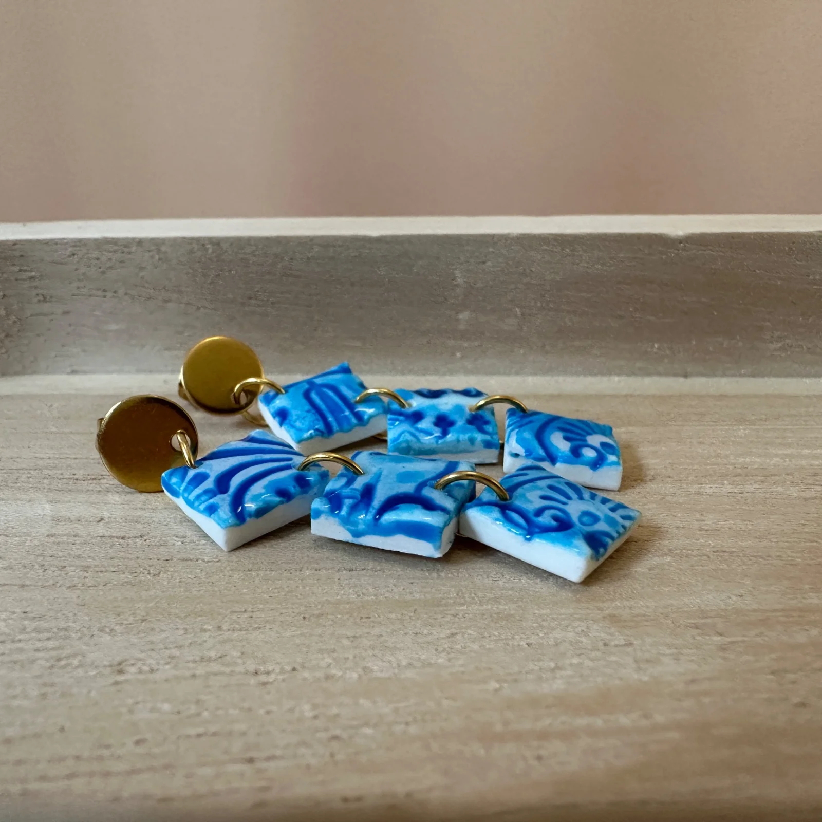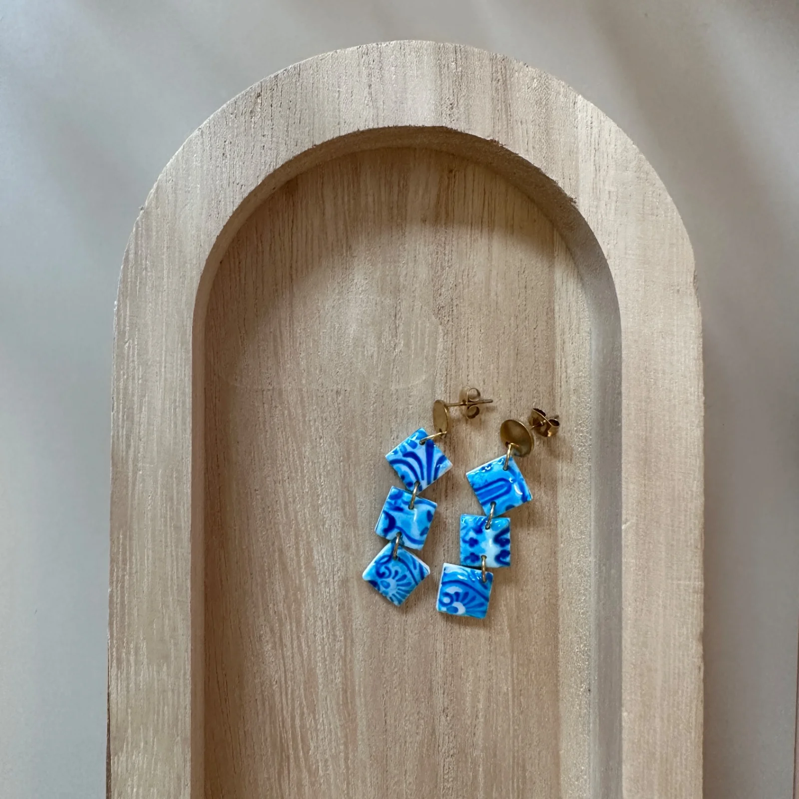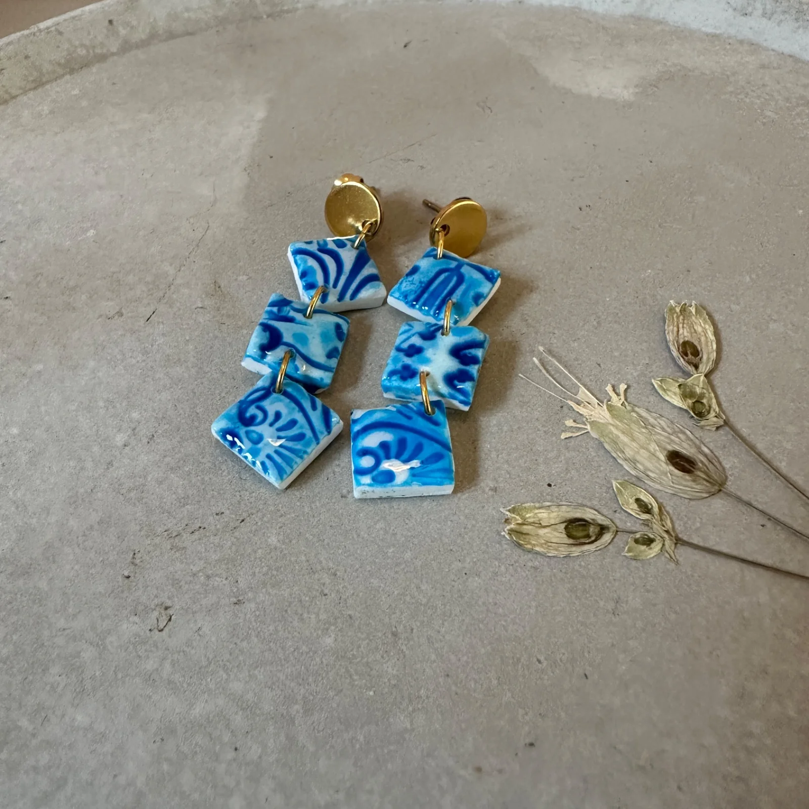 Wie ein Spaziergang durch Lissabons Gassen: Diese Ohrstecker bringen das typische Azulejo-Blau in miniaturisierter Kachelform an dein Ohr. Drei glänzende, blau-weiß gemusterte Rauten aus Polymer Clay schwingen unter einem goldfarbenen, runden Stecker – versiegelt mit einer hochglänzenden Epoxidharz-Schicht für diesen „frisch glasierten“ Look.