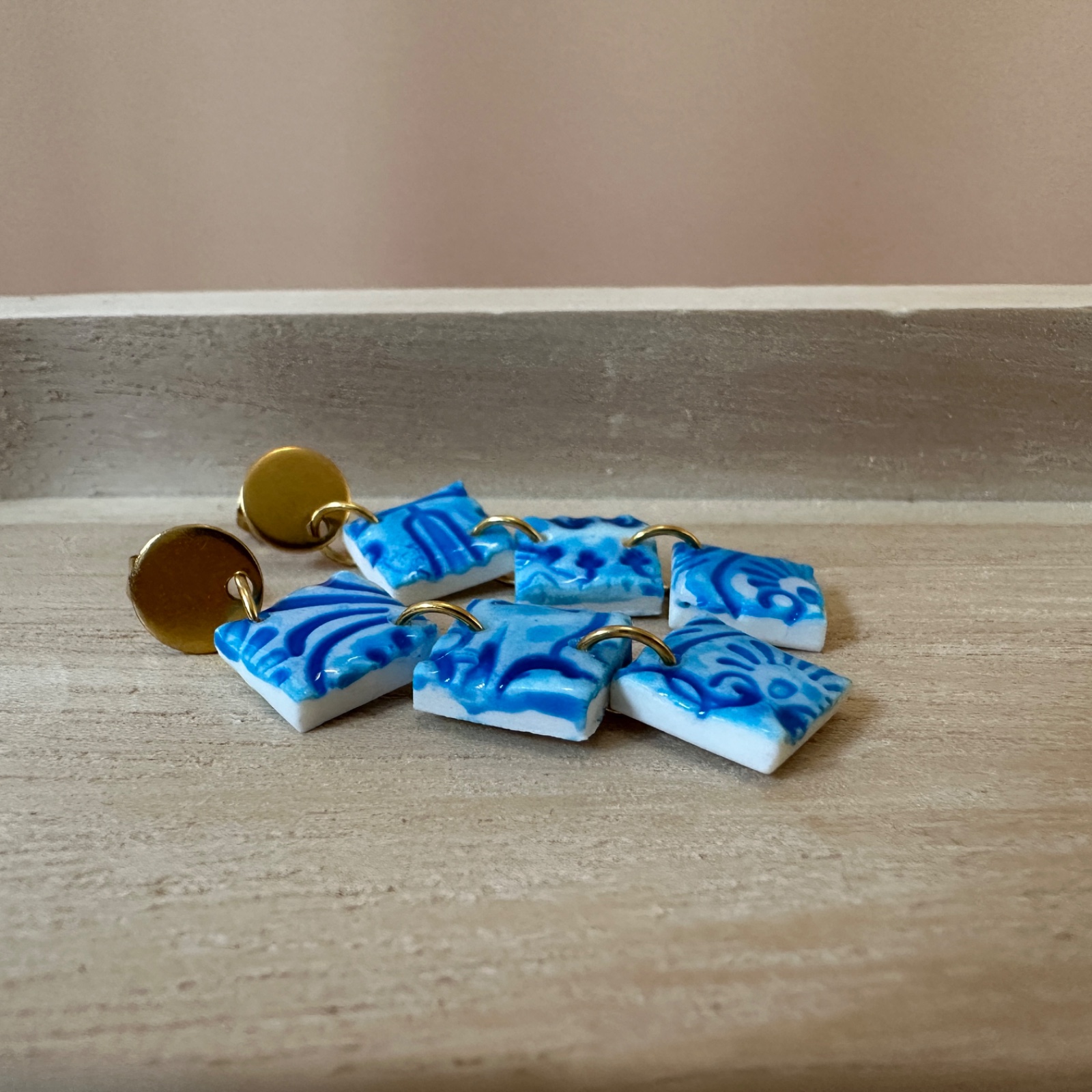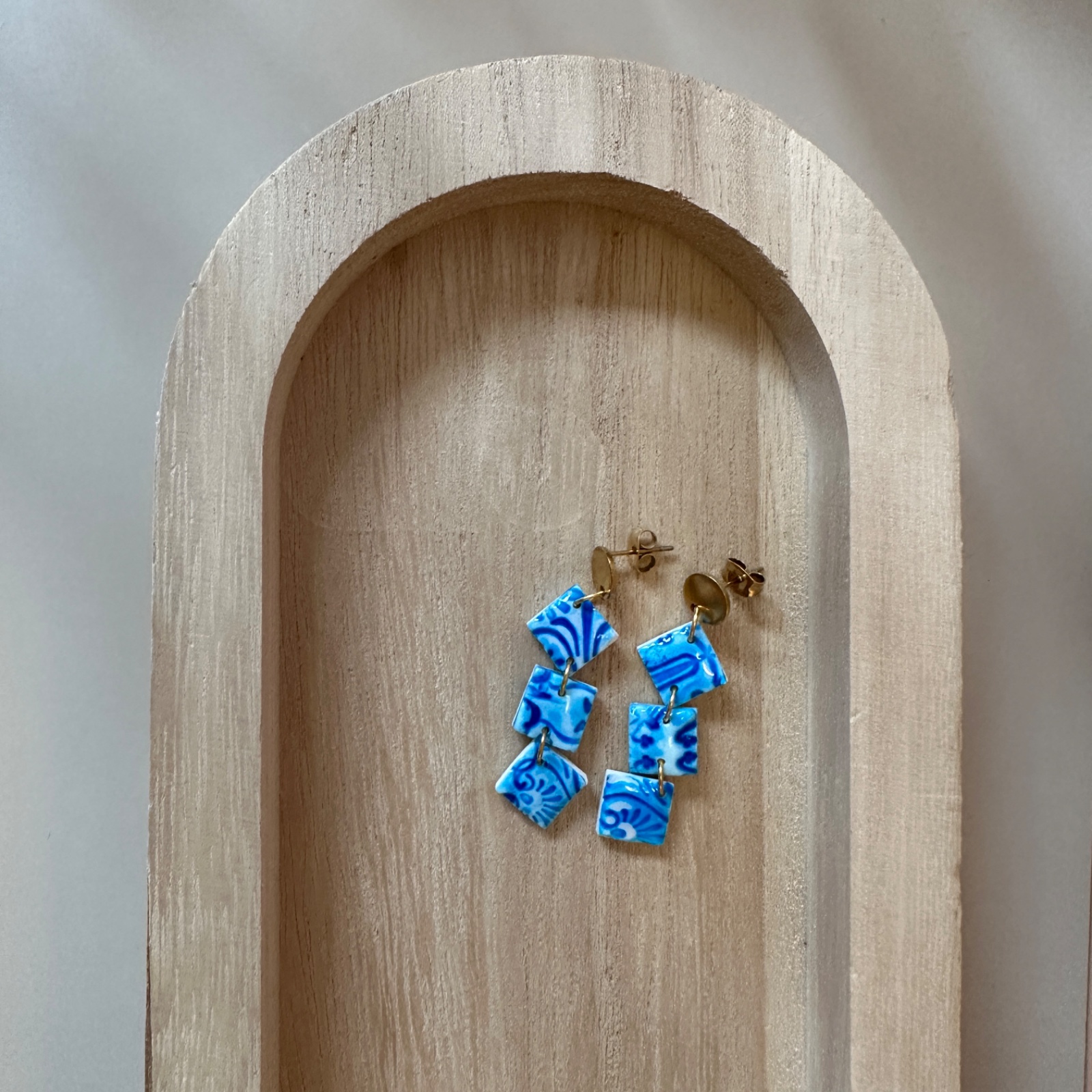Wie ein Hauch Mittelmeer am Ohr: Drei kleine Kacheln aus Polymer Clay schwingen in einer feinen Kette und tragen ein lebendiges Muster in Blau auf Weiß – wie handbemalte Keramik im Sonnenlicht. Der glänzende Finish bringt Tiefe in die Ornamente, während die goldfarbenen Elemente den Look warm und elegant abrunden.