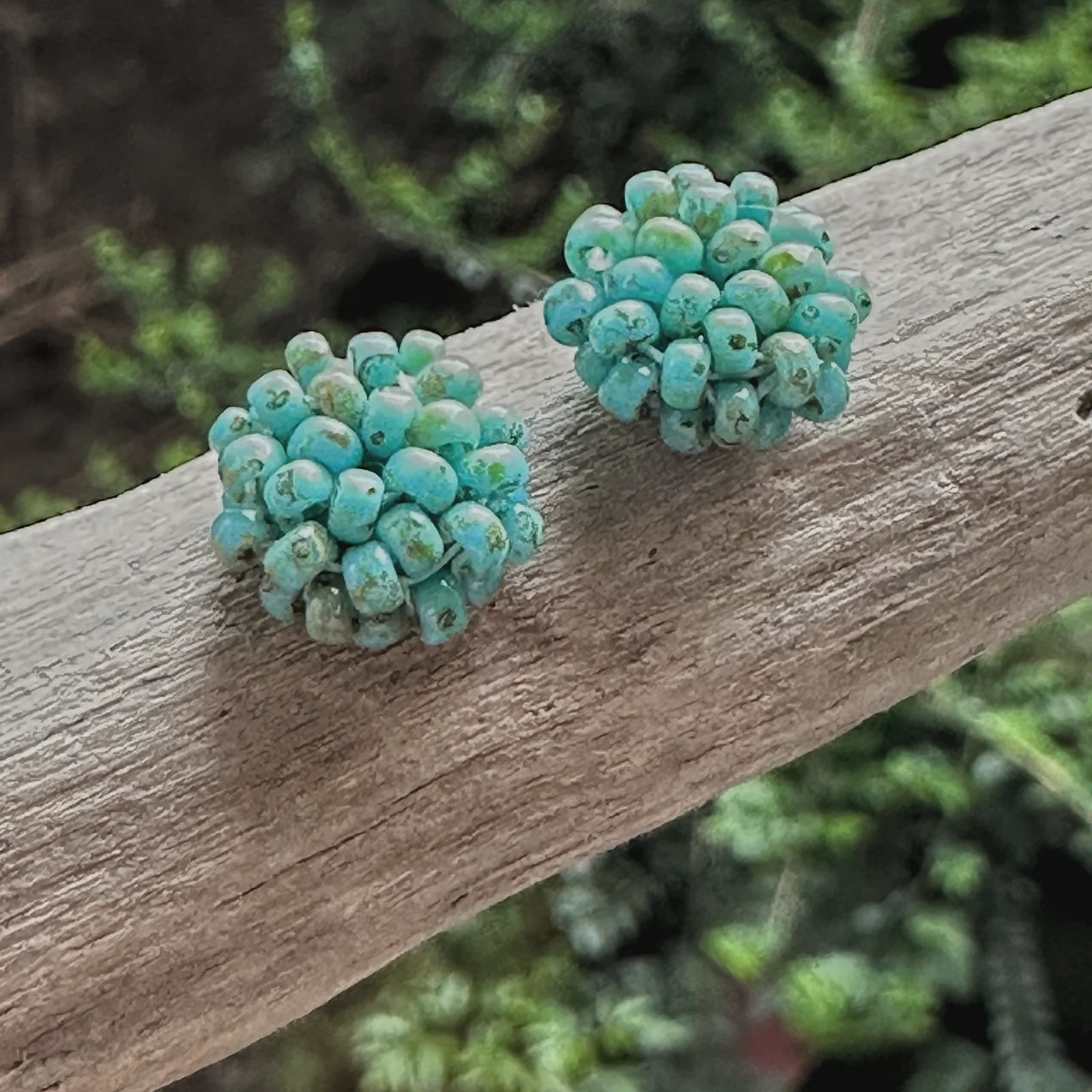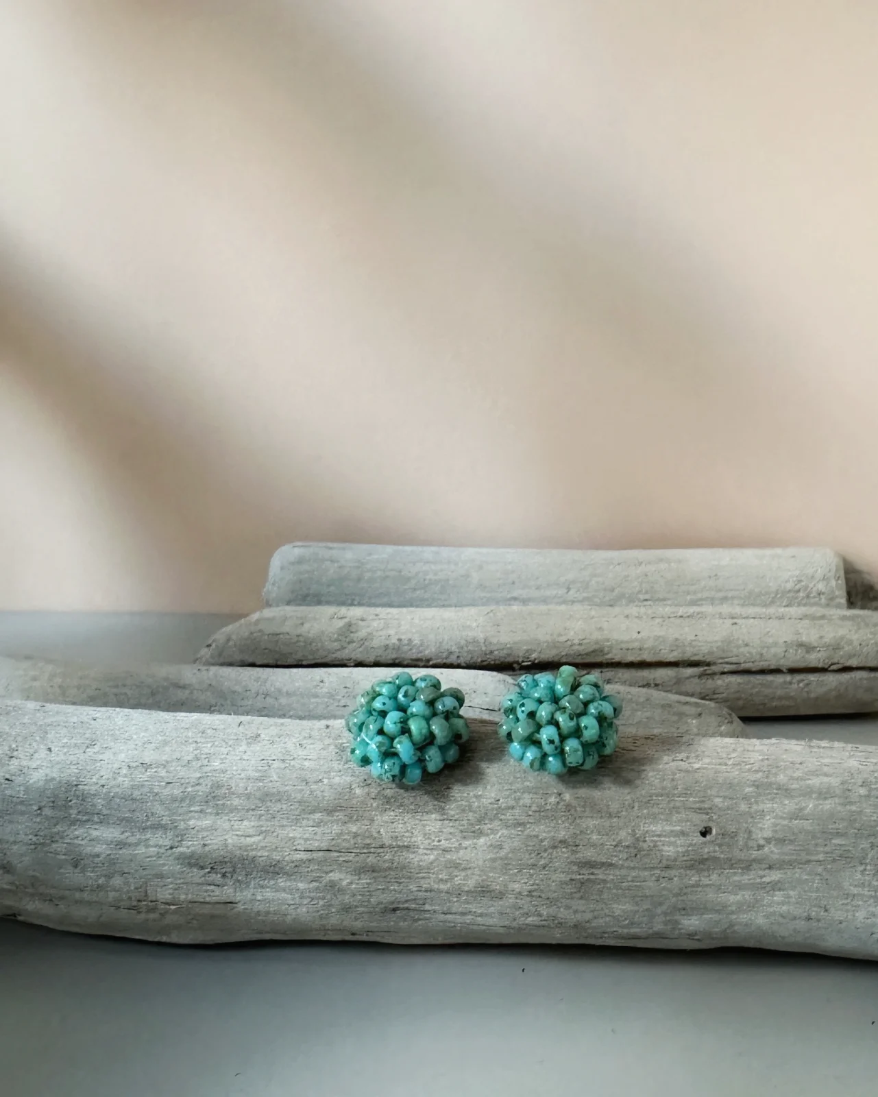 Wie eine frisch erblühte Dahlienblüte, die sich in strahlendem Türkis entfaltet – diese Ohrstecker tragen die ganze Leichtigkeit eines Sommermorgens im Garten. Perle für Perle wurden die japanischen Miyuki Rocailles in der charakteristischen Picasso-Färbung von Hand aufgefädelt und formen gemeinsam eine kleine, dreidimensionale Blüte: türkis, mintgrün, mit einem Hauch erdiger Tiefe, die das Picasso-Finish so unverwechselbar macht. Jede Blüte ist ein Unikat – lebendig, organisch und voller Charakter.