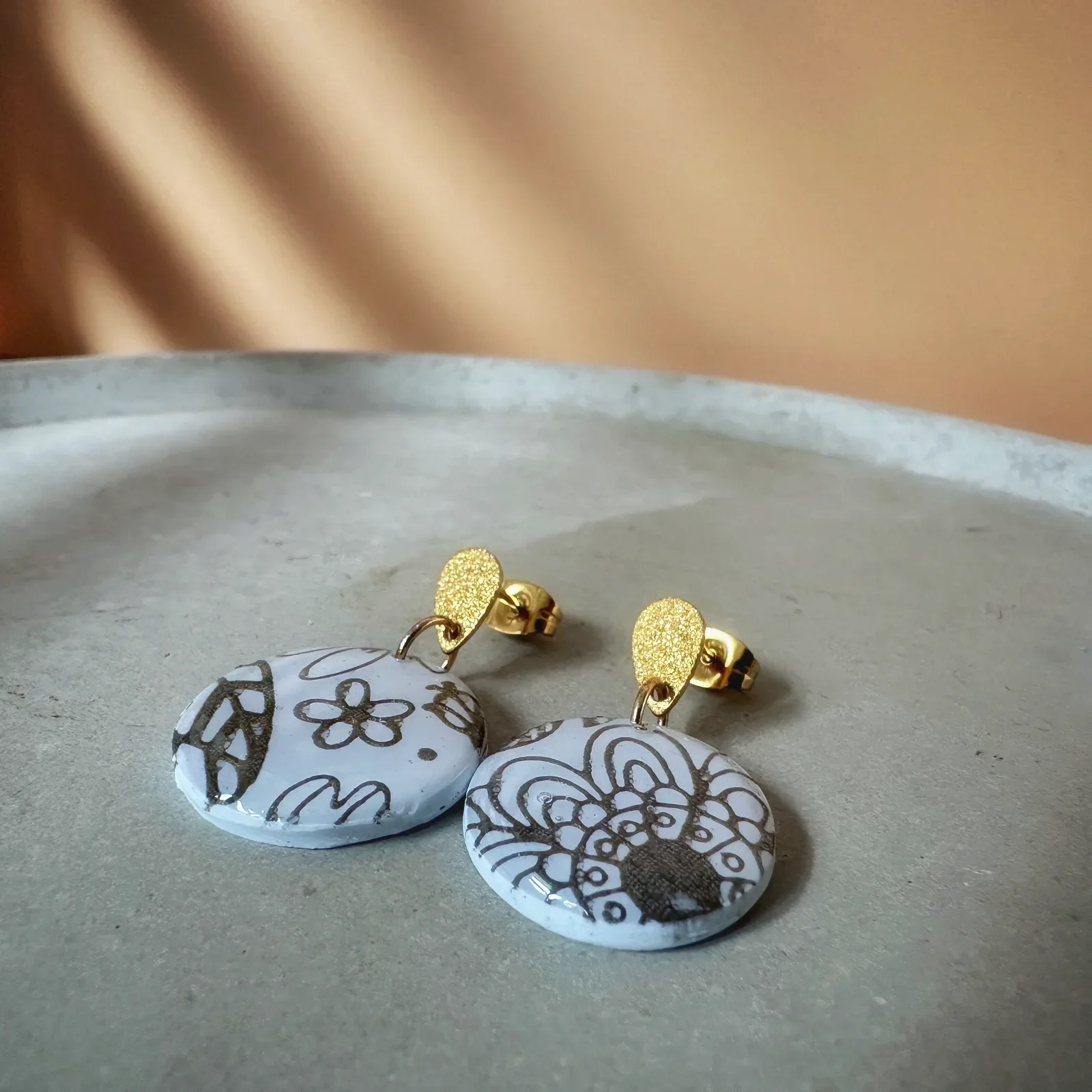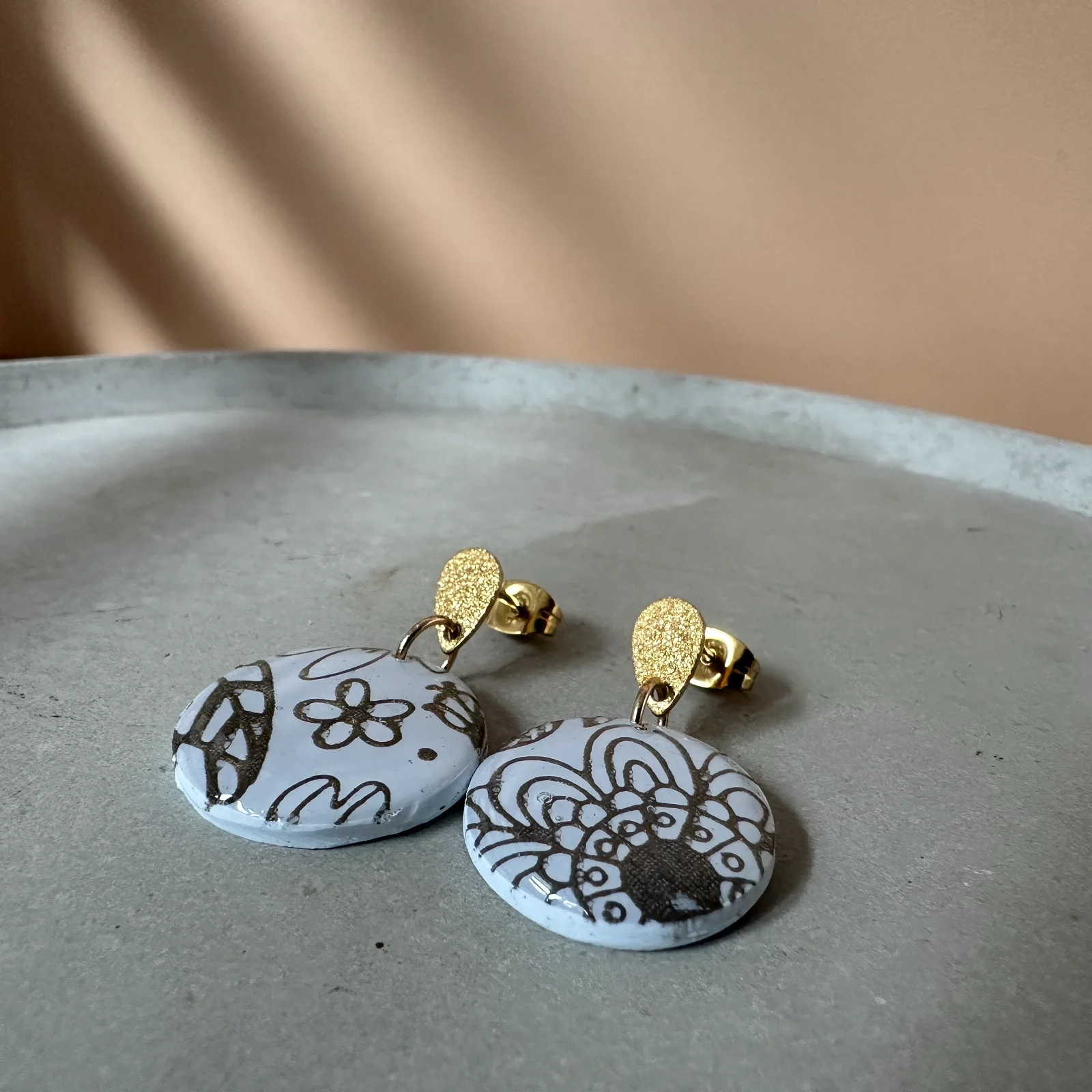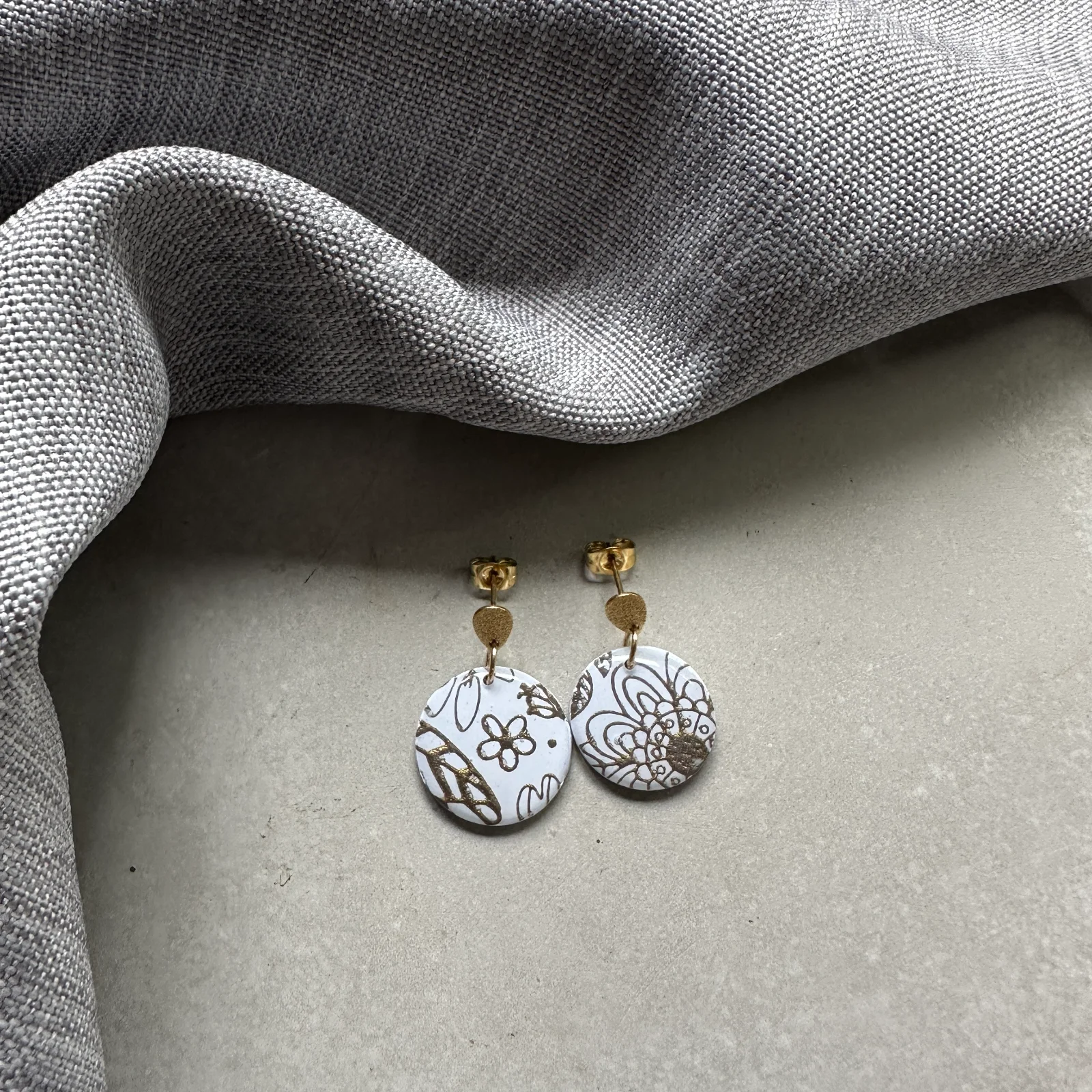 Wie kleine Skizzen aus einem Sommer-Notizbuch: Diese runden Anhänger in sanftem Weiß tragen goldene Blütenlinien und wirken verspielt und elegant. Oben funkeln matt-goldene Stecker wie ein winziger Sonnenreflex – ein ruhiger Kontrast, der das Design edel abrundet.