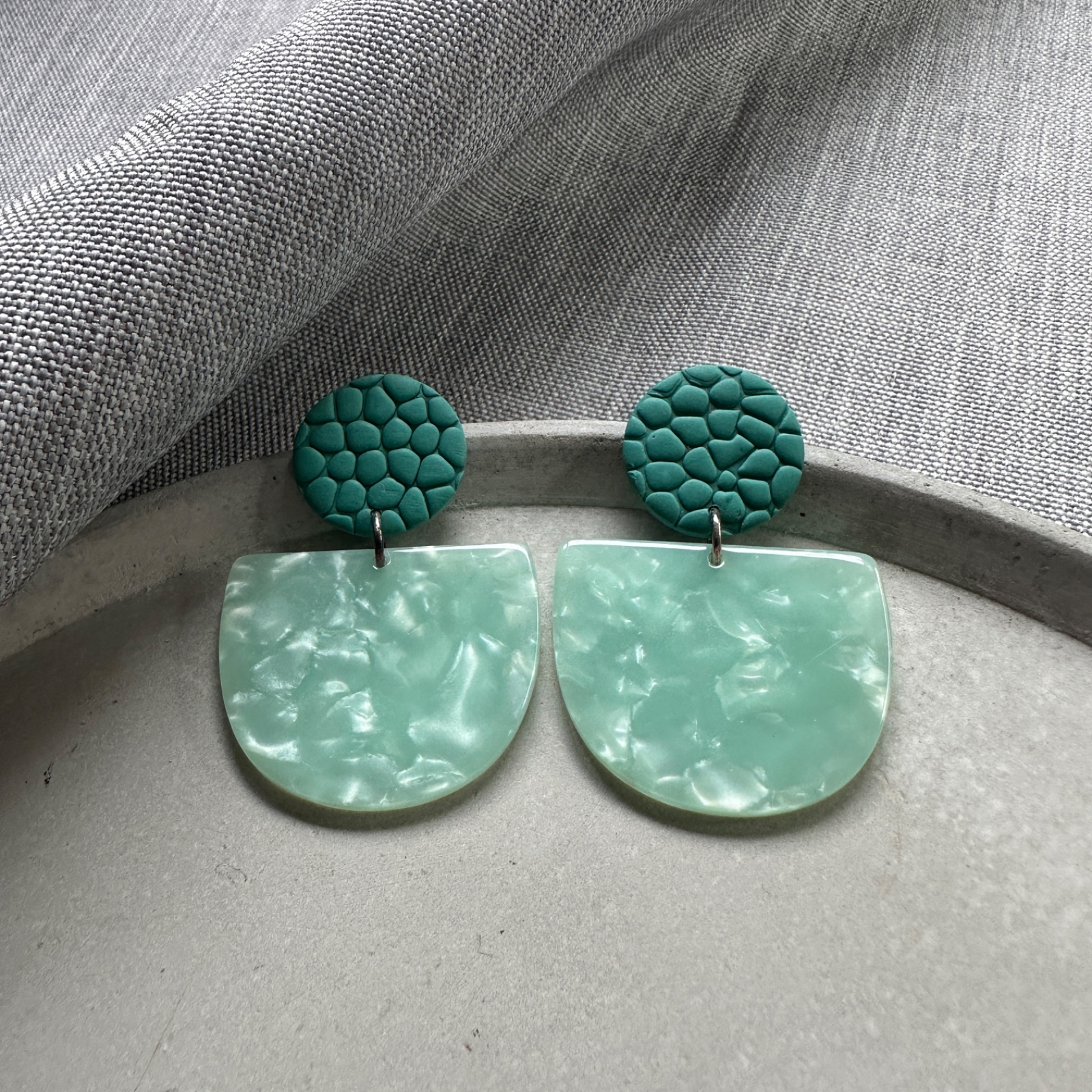 Wie ein Sprung ins klare Wasser: Diese handgemachten Statement-Pieces spielen mit zwei Grüntönen, die an Lagune und Meeresgrund erinnern. Oben sitzt eine matte, strukturierte Scheibe aus Polymer Clay im dunkleren Petrol – darunter schwingt ein halbmondförmiges Element in milchigem Mint mit perlmuttigem Marmor-Schimmer, das das Licht weich einfängt.