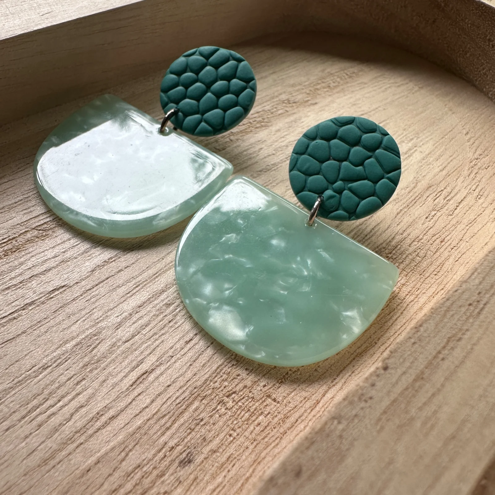 Wie ein Sprung ins klare Wasser: Diese handgemachten Statement-Pieces spielen mit zwei Grüntönen, die an Lagune und Meeresgrund erinnern. Oben sitzt eine matte, strukturierte Scheibe aus Polymer Clay im dunkleren Petrol – darunter schwingt ein halbmondförmiges Element in milchigem Mint mit perlmuttigem Marmor-Schimmer, das das Licht weich einfängt.
