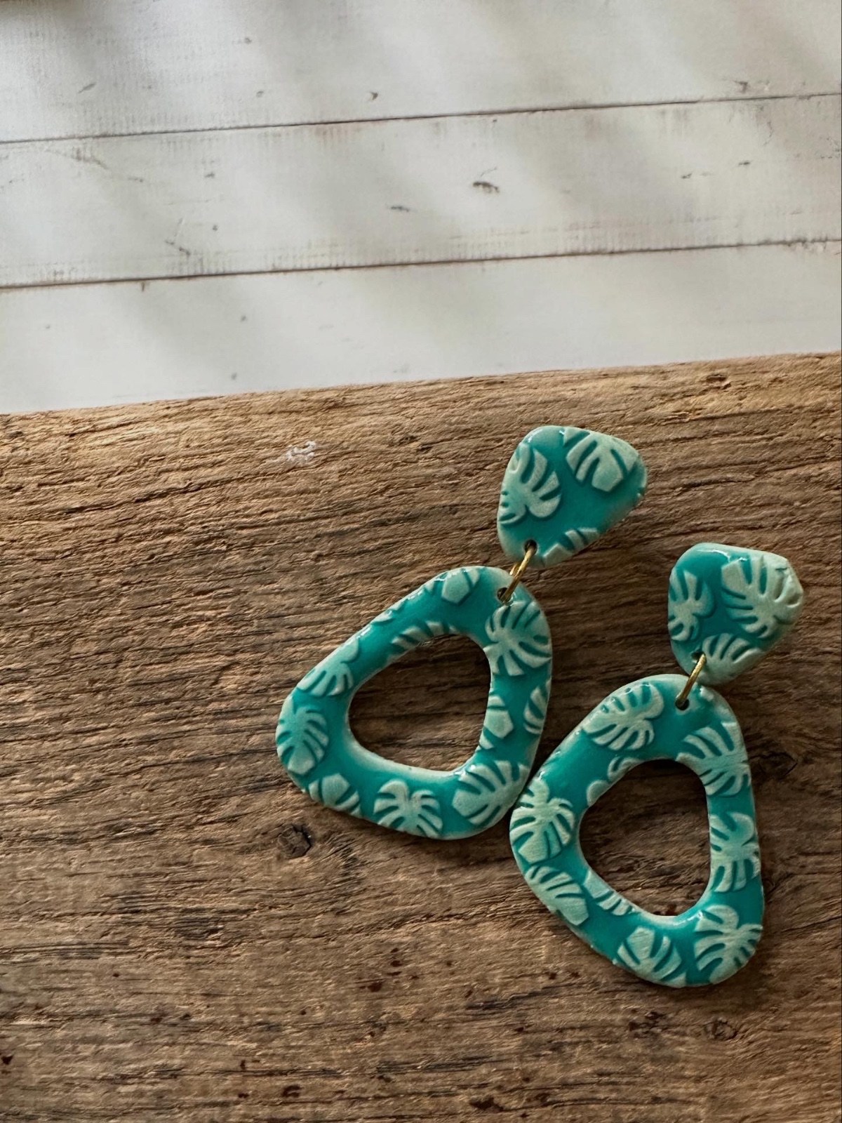 Wie ein kurzer Sprung ins türkisfarbene Wasser: Diese handgemachten Statement-Pieces leuchten in sattem Lagoon-Blau mit zarten, hellen Monstera-Blättern als Relief. Die organischen, offenen Tropfenformen aus Polymer Clay wirken leicht und modern, während die goldfarbenen Verbindungen einen warmen, sonnigen Kontrast setzen.
