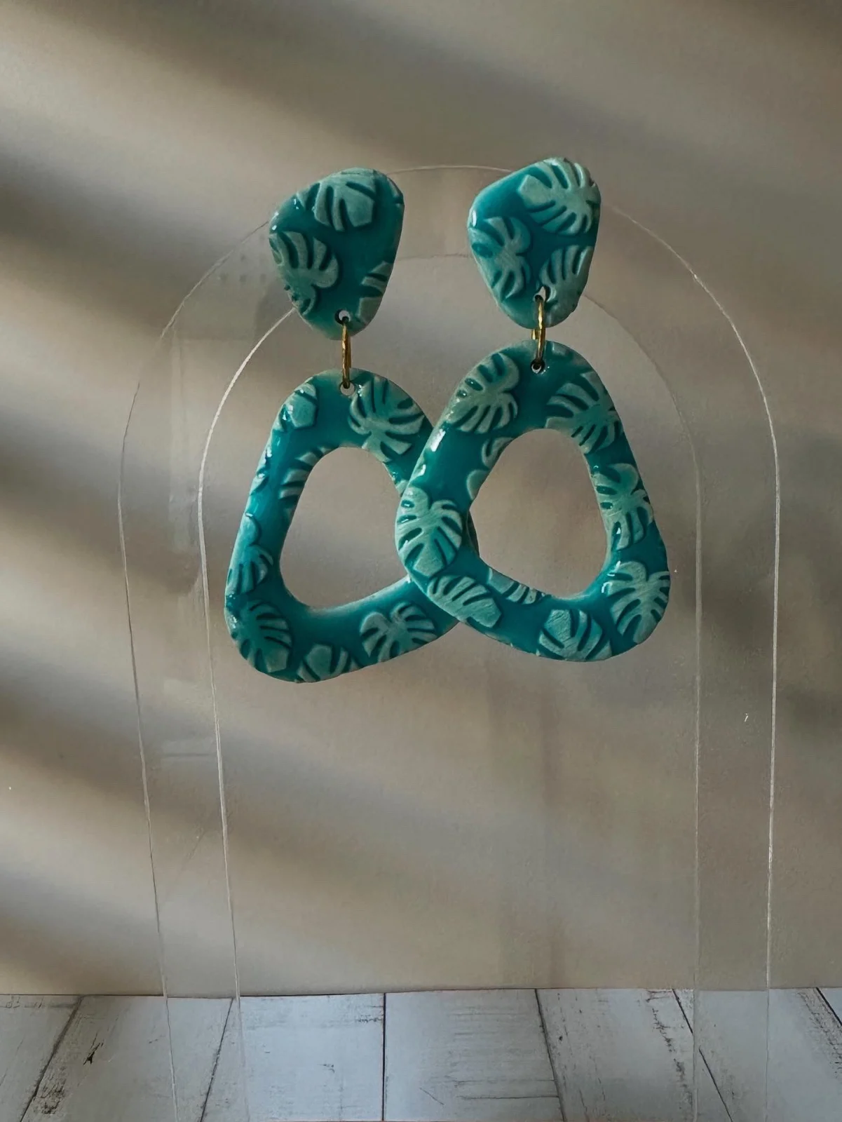 Wie ein kurzer Sprung ins türkisfarbene Wasser: Diese handgemachten Statement-Pieces leuchten in sattem Lagoon-Blau mit zarten, hellen Monstera-Blättern als Relief. Die organischen, offenen Tropfenformen aus Polymer Clay wirken leicht und modern, während die goldfarbenen Verbindungen einen warmen, sonnigen Kontrast setzen.