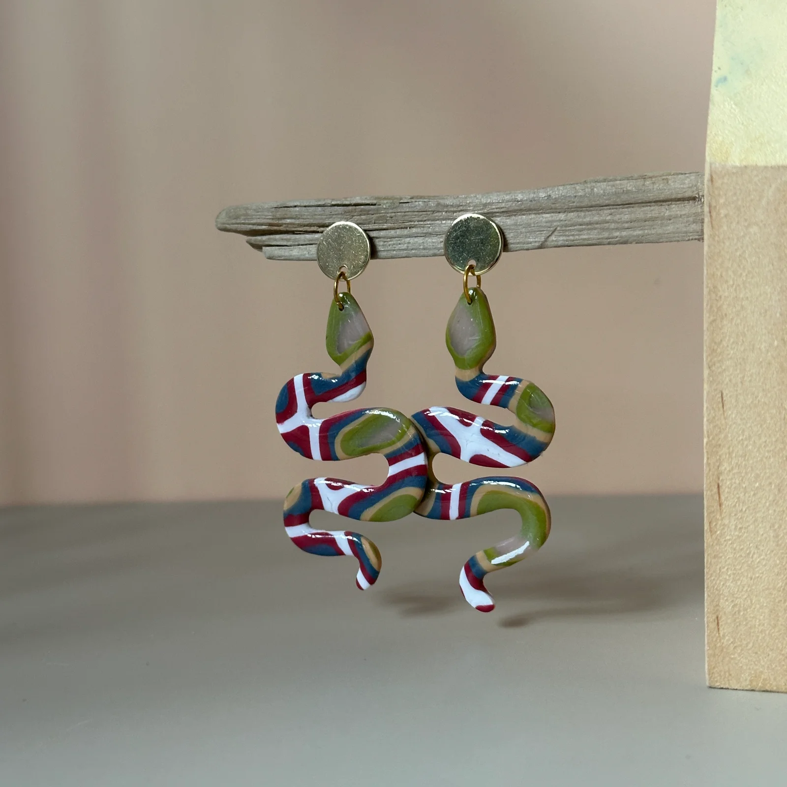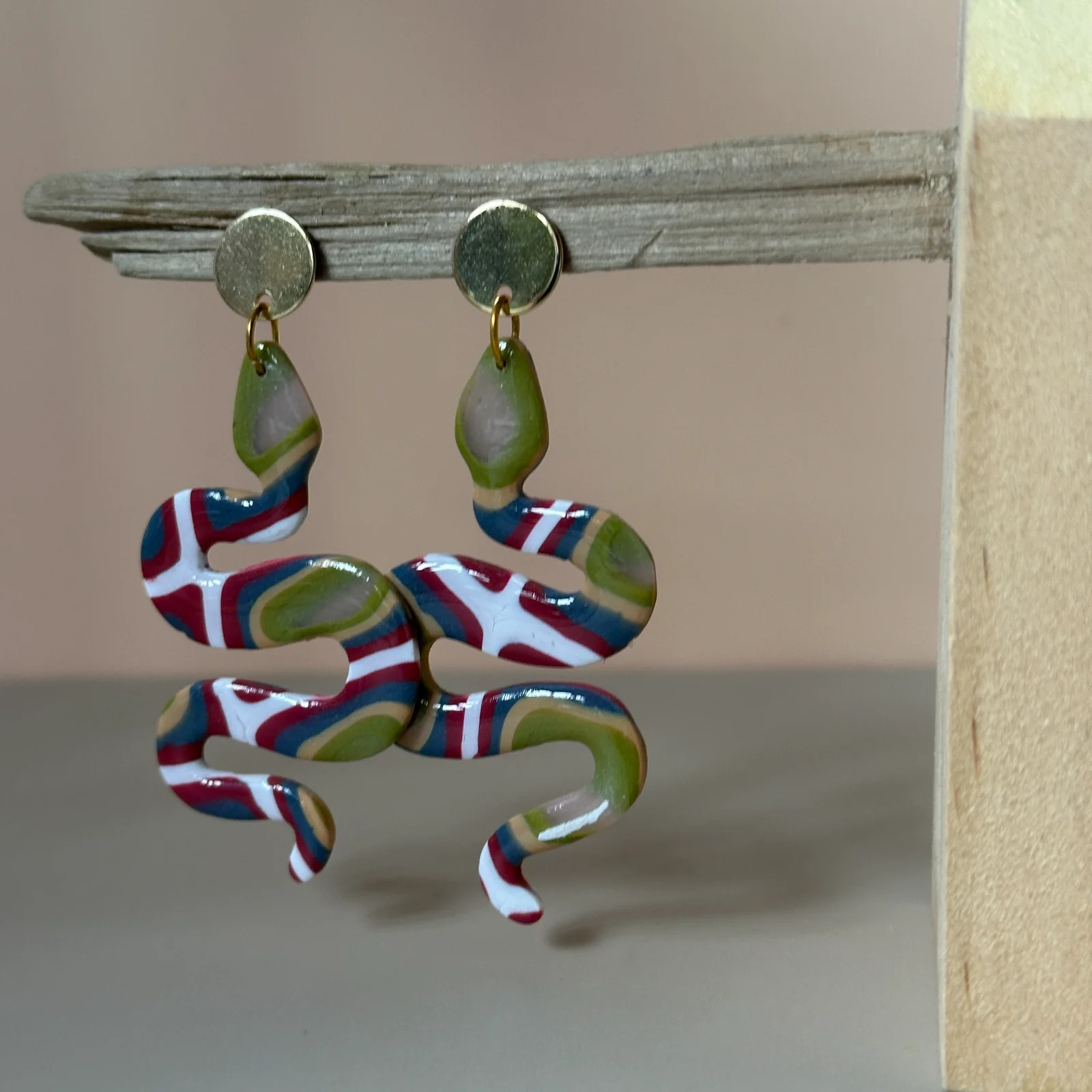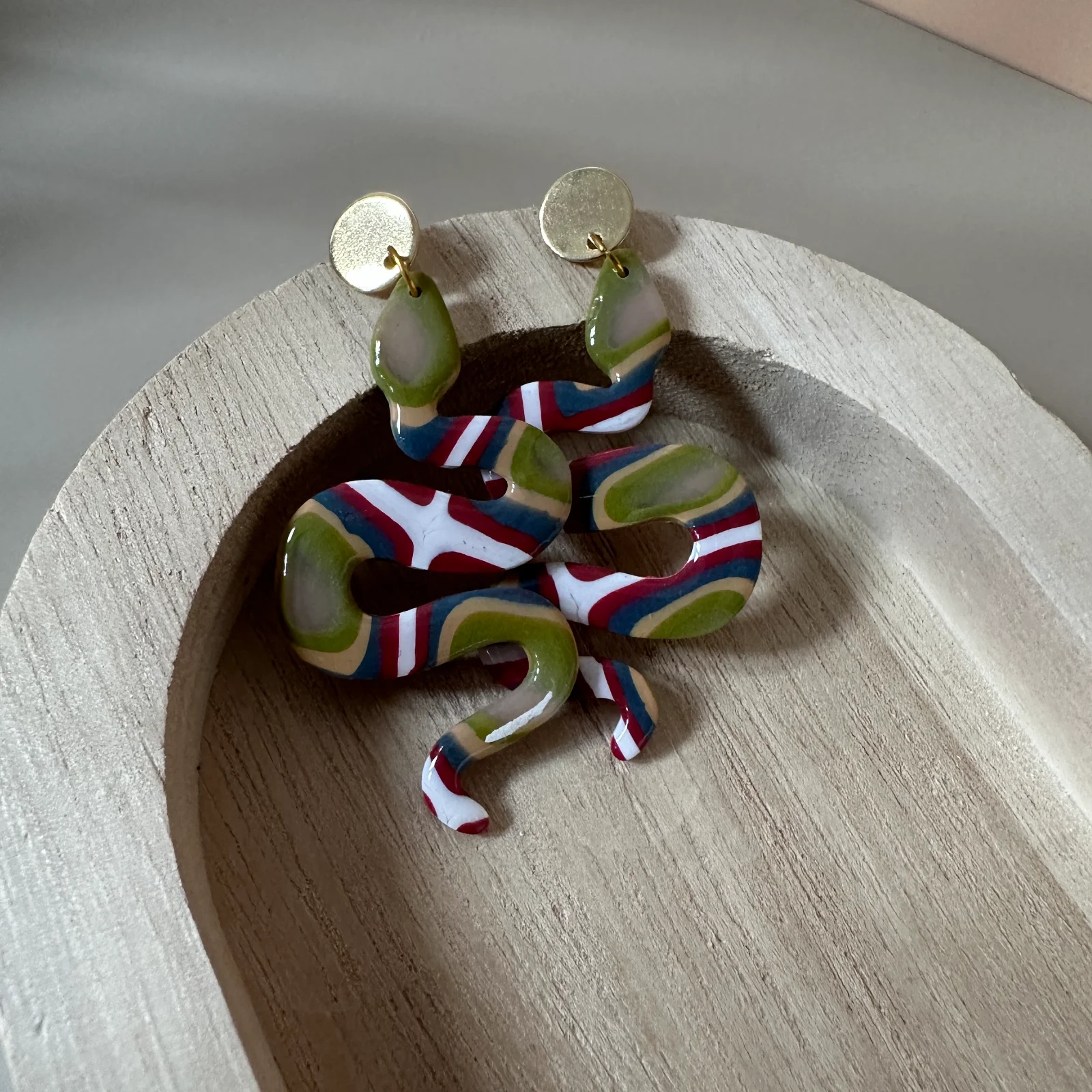 Diese geschwungenen Statement-Pieces sehen aus wie ein kleiner Tanz in der Luft – glänzend, lebendig und voller Bewegung. Die wellige Form aus Polymer Clay ist mit einem retro-inspirierten Muster aus Olivgrün, Bordeauxrot, Cremeweiß, Petrol und warmem Beige verziert, dazu ein matt-goldener Stecker als ruhiger Kontrast.