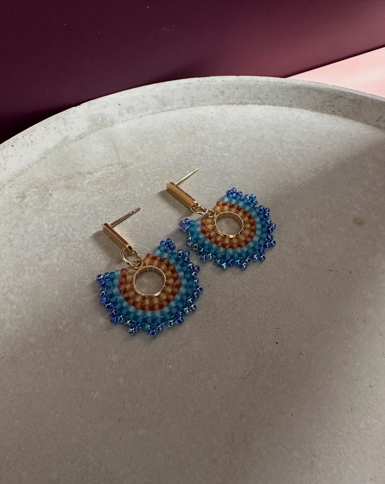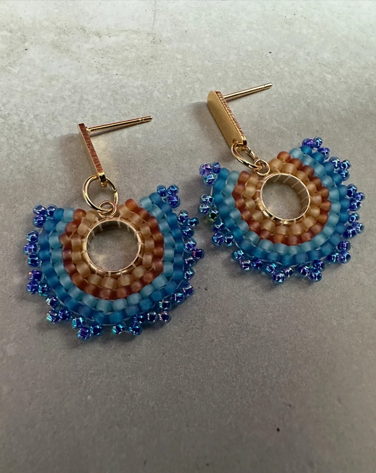 Wie ein kleiner Sonnenuntergang am Meer – diese fächerförmigen Ohrringe sind aus winzigen Miyuki-Glasperlen von Hand gefädelt und strahlen eine ganz besondere Ruhe aus. Die konzentrischen Streifen in warmem Terrakotta, sanftem Hellblau und leuchtendem Irisblau erinnern an Wellen, die sich um einen goldenen Mittelpunkt legen. Der metallisch schimmernde Zackenrand aus irisierenden Perlen verleiht jedem Stück etwas Magisches.