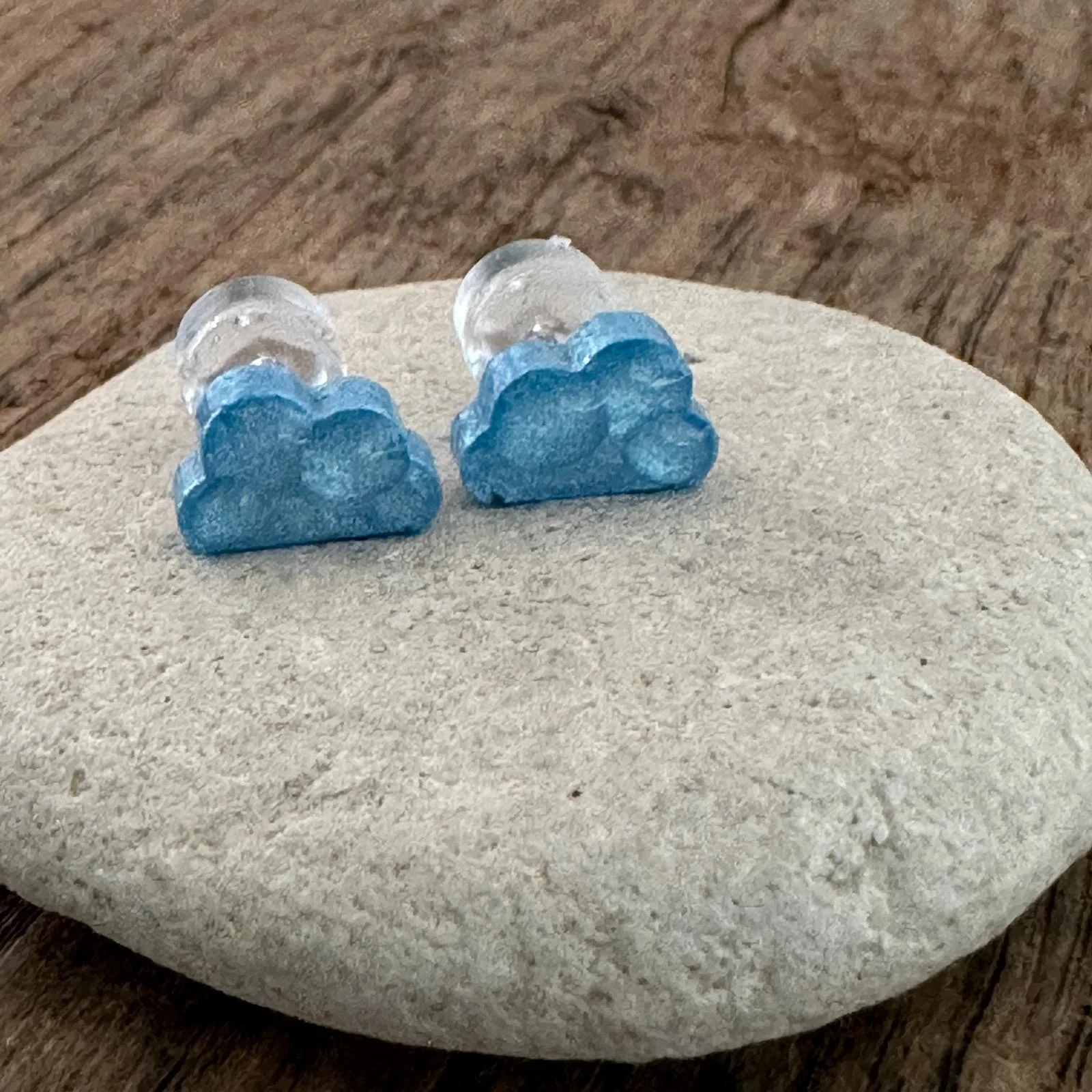 Zwei kleine Wolken, wie frisch aus einem klaren Morgenhimmel gepflückt: schimmerndes Blau mit sanfter Struktur, gekrönt von einer transparenten, glasklaren Wölbung. Die Form ist verspielt und minimal zugleich – ein kleines Stück Himmel zum Anstecken, handgefertigt und voller Leichtigkeit.