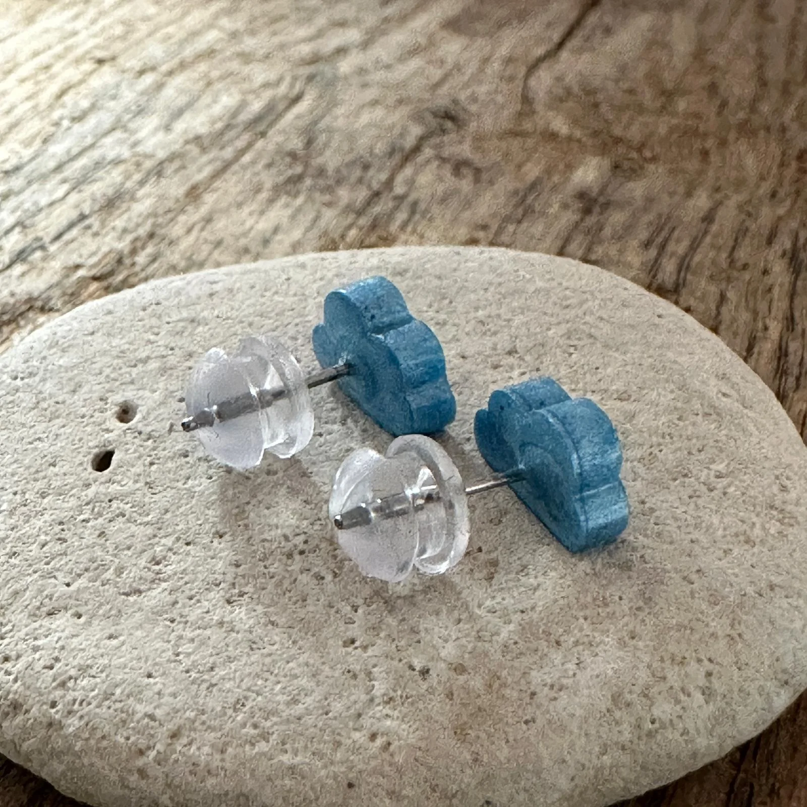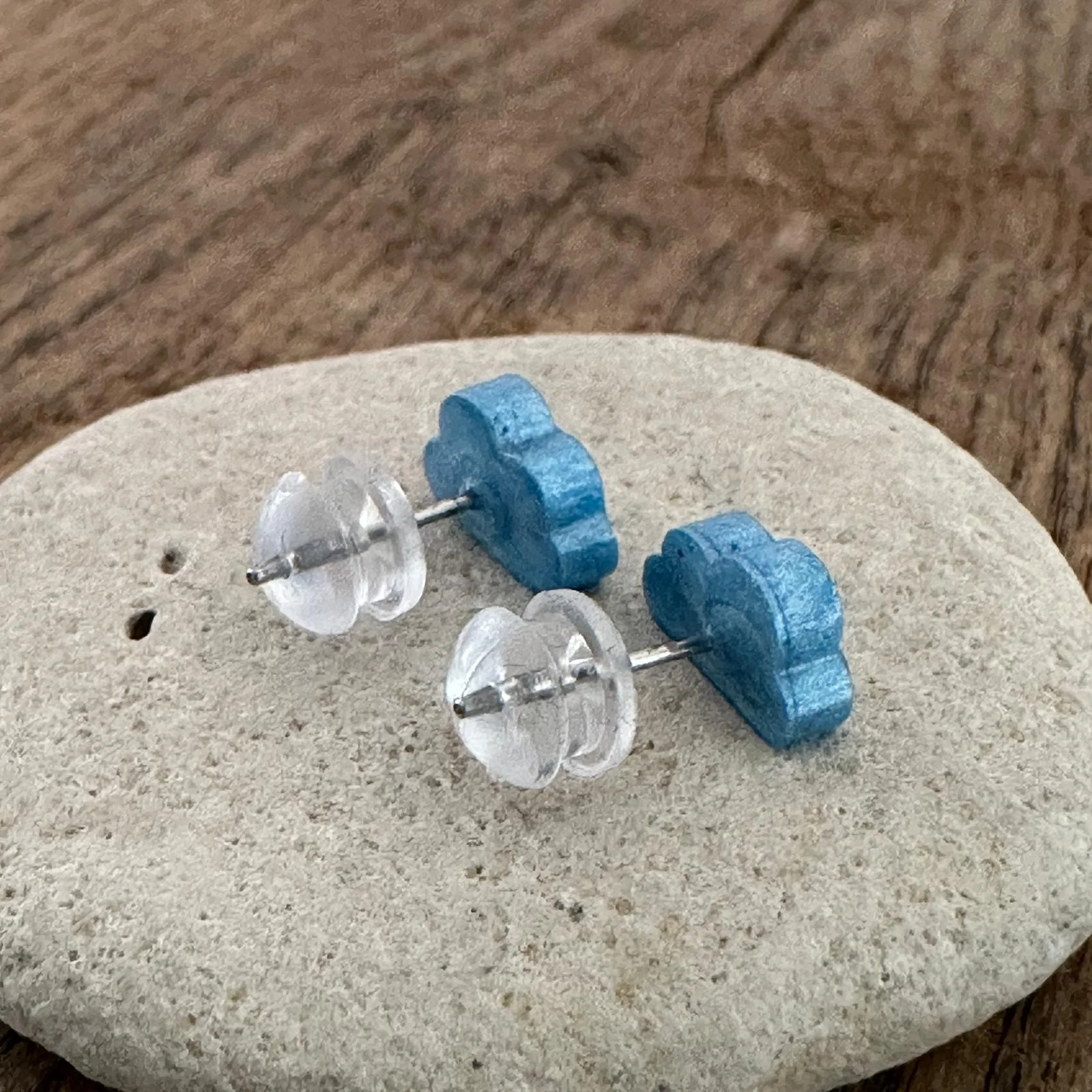 Zwei kleine Wolken, wie frisch aus einem klaren Morgenhimmel gepflückt: schimmerndes Blau mit sanfter Struktur, gekrönt von einer transparenten, glasklaren Wölbung. Die Form ist verspielt und minimal zugleich – ein kleines Stück Himmel zum Anstecken, handgefertigt und voller Leichtigkeit.